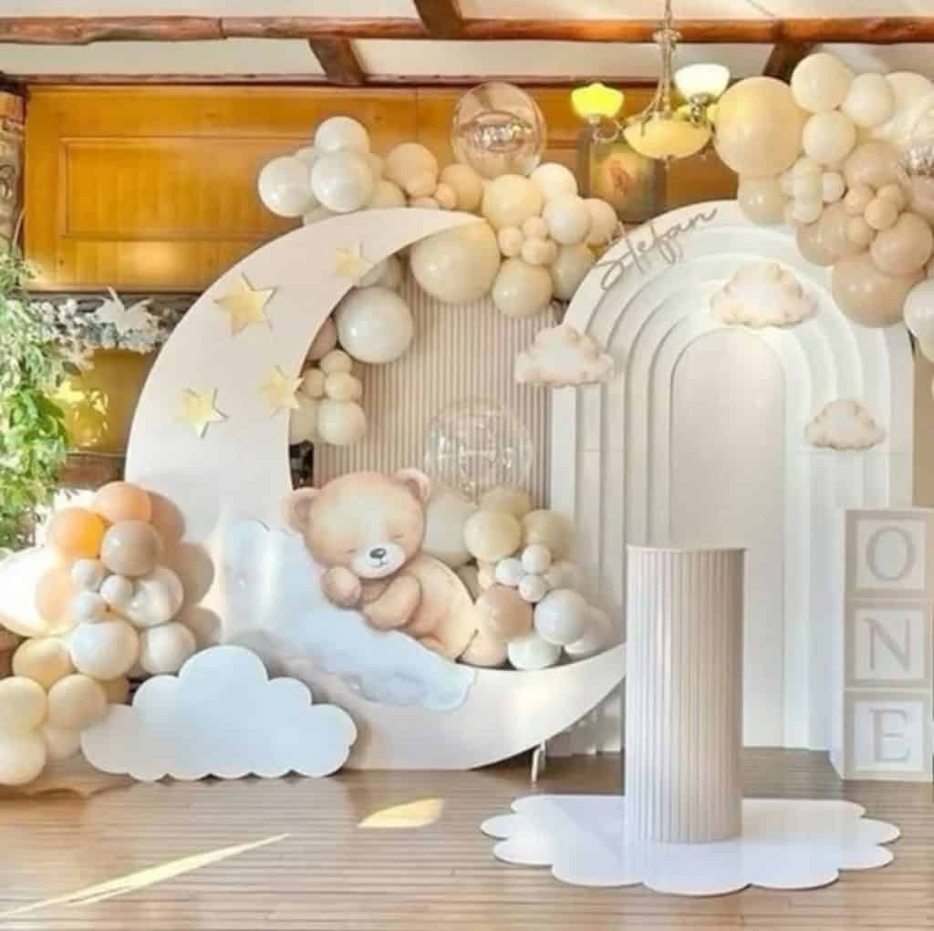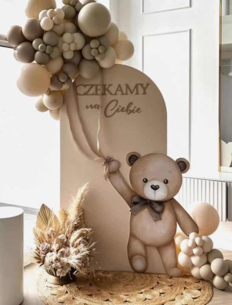 Creează un colț foto cu ursuleți de pluș, tonuri calde de bej, alb și piersică, și accente delicate din materiale naturale (lemn, in, bumbac).