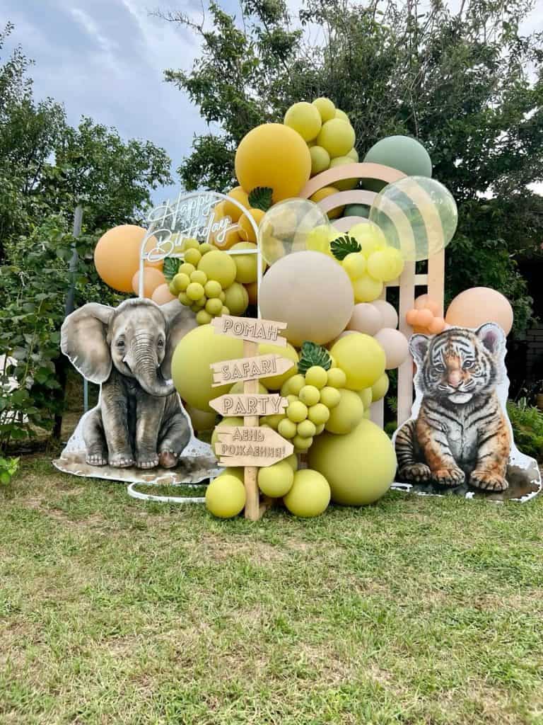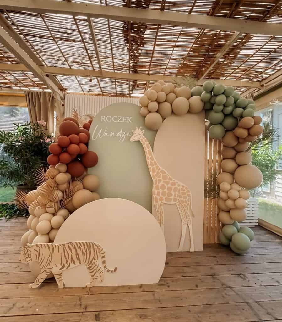 Sfat: poți adăuga un fundal din baloane verzi și aurii, plus o pancartă mare cu numele bebelușului în stil safari.
