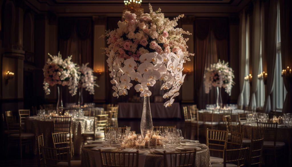 Everything is about visual impact and wow factor – luxurious decor, tables with metallic accents, ample arrangements and gala atmosphere.