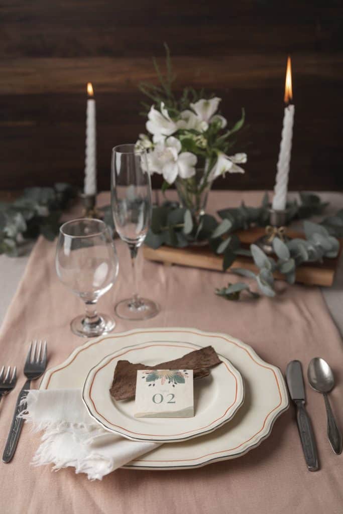 The Rustic Chic style combines natural wood, candles, greenery and bohemian accents in a romantic and intimate aesthetic.